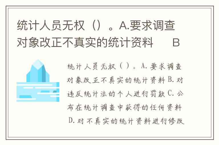 统计人员无权()。A.要求调查对象改正不真实的统计资料 B.对违反统计法的个人进行罚款 C.公布在统计调查中获得的任何资料 D.对不真实的统计资料进行修改