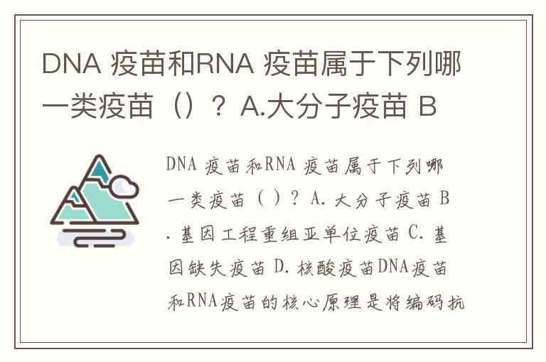 DNA 疫苗和RNA 疫苗属于下列哪一类疫苗()?A.大分子疫苗 B.基因工程重组亚单位疫苗 C.基因缺失疫苗 D.核酸疫苗