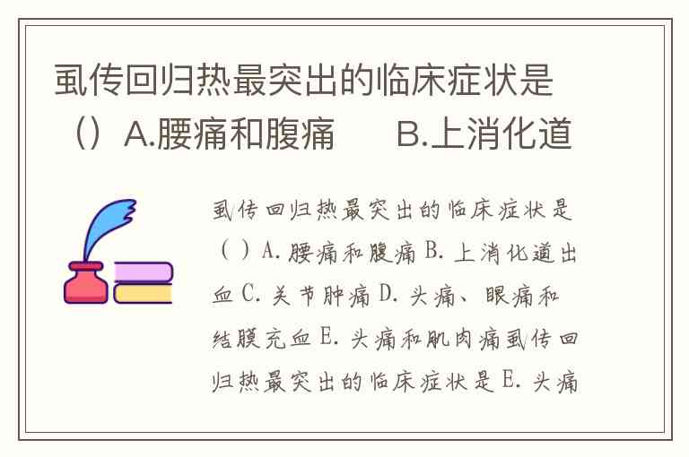 虱传回归热最突出的临床症状是()A.腰痛和腹痛 B.上消化道出血 C.关节肿痛 D.头痛、眼痛和结膜充血 E.头痛和肌肉痛