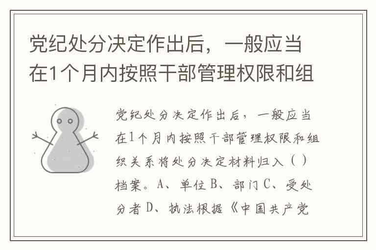 党纪处分决定作出后,一般应当在1个月内按照干部管理权限和组织关系将处分决定材料归入()档案。A、单位 B、部门 C、受处分者 D、执法