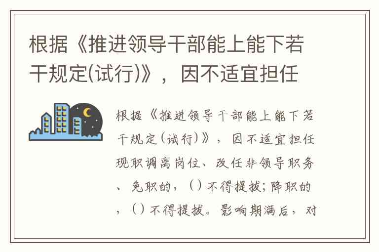 根据《推进领导干部能上能下若干规定(试行)》,因不适宜担任现职调离岗位、改任非领导职务、免职的,( )不得提拔;降职的,( )不得提拔。影响期满后,对德才表现和工作实绩突出,因工作需要且经考察符合任职条件的,可以提拔任职。A、一年内、三年内 B、两年内、三年内 C、一年内、一年内 D、一年内、两年内