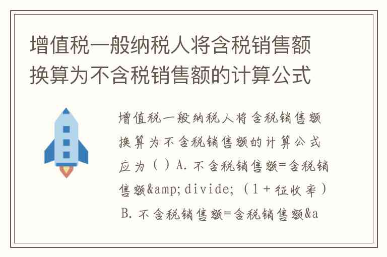 增值税一般纳税人将含税销售额换算为不含税销售额的计算公式应为()A.不含税销售额=含税销售额÷(1+征收率) B.不含税销售额=含税销售额÷(1-征收率) C.不含税销售额=含税销售额÷(1+适用税率) D.不含税销售额=含税销售额÷(1-适用税率)