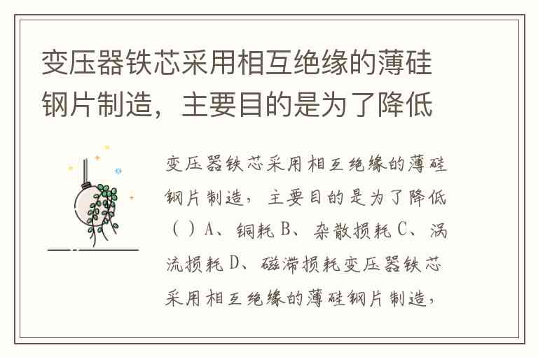 变压器铁芯采用相互绝缘的薄硅钢片制造,主要目的是为了降低()A、铜耗 B、杂散损耗 C、涡流损耗 D、磁滞损耗