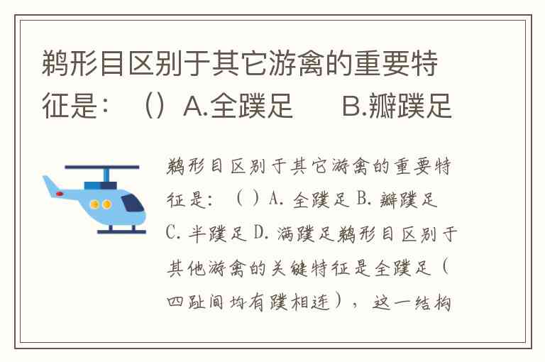 鹈形目区别于其它游禽的重要特征是:()A.全蹼足 B.瓣蹼足 C.半蹼足 D.满蹼足
