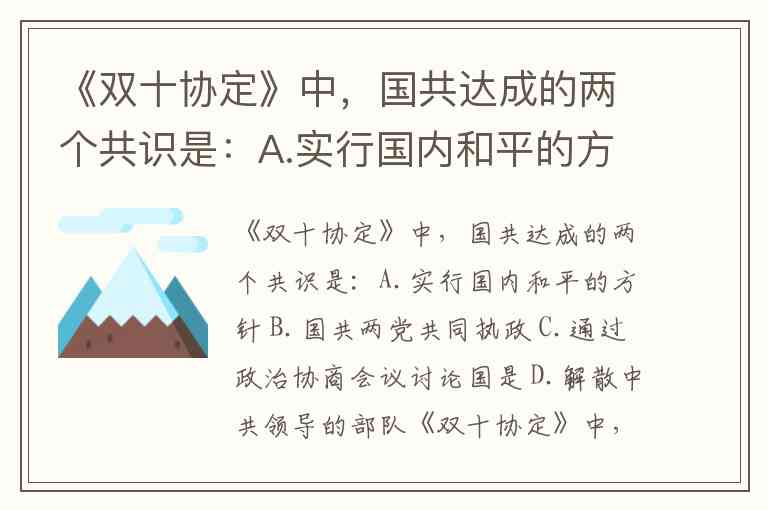 《双十协定》中,国共达成的两个共识是A.实行国内和平的方针和C.通过政治协商会议讨论国是。