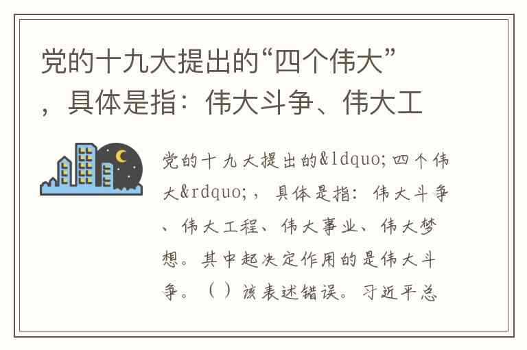 党的十九大提出的“四个伟大”,具体是指:伟大斗争、伟大工程、伟大事业、伟大梦想。其中起决定作用的是伟大斗争。()
