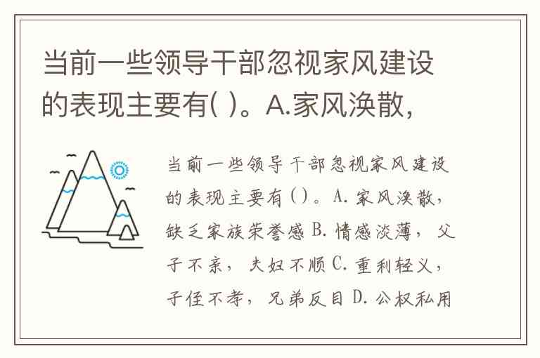 当前一些领导干部忽视家风建设的表现主要有( )。A.家风涣散,缺乏家族荣誉感 B.情感淡薄,父子不亲,夫妇不顺 C.重利轻义,子侄不孝,兄弟反目 D.公权私用,优亲厚友,家族腐败严重