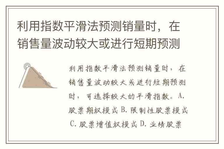 利用指数平滑法预测销量时,在销售量波动较大或进行短期预测时,可选择较大的平滑指数。A.股票期权模式 B.限制性股票模式 C.股票增值权模式 D.业绩股票激励模式
