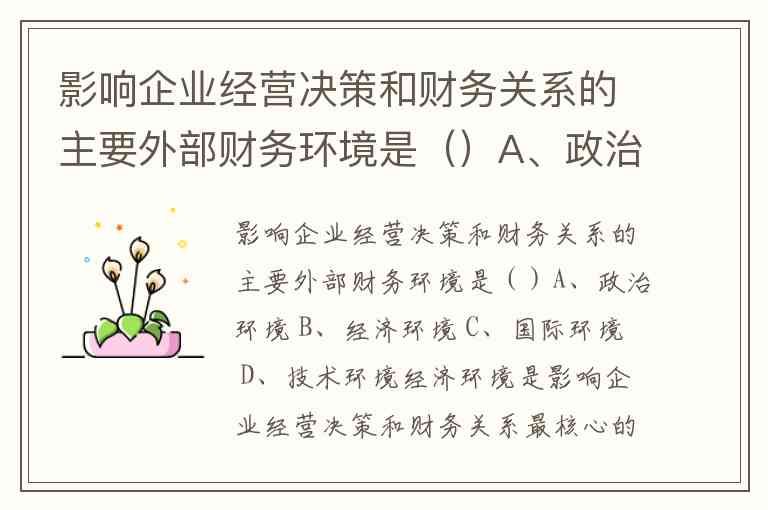 影响企业经营决策和财务关系的主要外部财务环境是()A、政治环境 B、经济环境 C、国际环境 D、技术环境