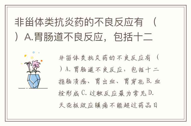 过敏反应并非NSAIDs最常见的不良反应,其发生率远低于胃肠道和心血管问题。过敏症状以皮肤瘙痒、风疹为主,严重者如剥脱性皮炎或过敏性休克极为罕见。相比之下,肝肾功能损害(与剂量相关)、神经系统症状(头痛、眩晕)等不良反应更为常见,但未在选项中出现。