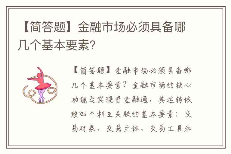金融市场的核心功能是实现资金融通,其运转依赖四个相互关联的基本要素:交易对象、交易主体、交易工具和交易价格。这些要素共同构成了金融市场的基础框架,缺一不可。