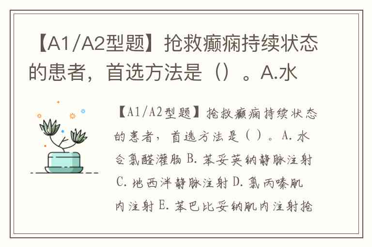 【A1/A2型题】抢救癫痫持续状态的患者,首选方法是()。A.水合氯醛灌肠 B.苯妥英钠静脉注射 C.地西泮静脉注射 D.氯丙嗪肌内注射 E.苯巴比妥钠肌内注射