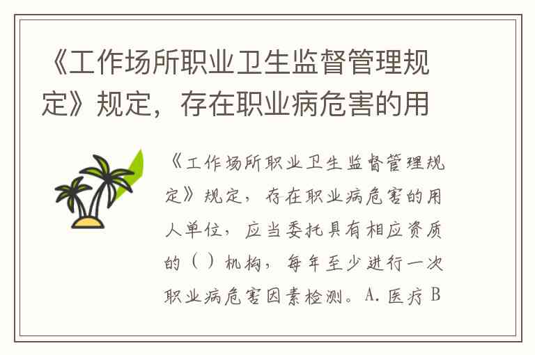 《工作场所职业卫生监督管理规定》规定,存在职业病危害的用人单位,应当委托具有相应资质的()机构,每年至少进行一次职业病危害因素检测。A.医疗 B.职业卫生技术服务 C.卫生检疫