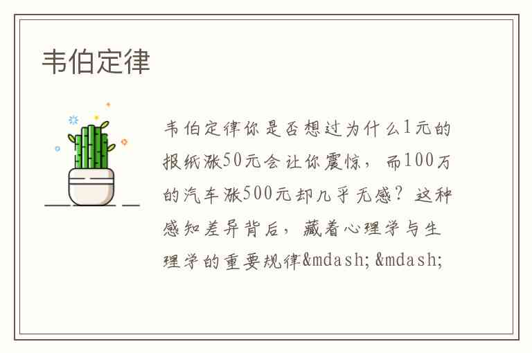 你是否想过为什么1元的报纸涨50元会让你震惊,而100万的汽车涨500元却几乎无感?这种感知差异背后,藏着心理学与生理学的重要规律——韦伯定律。19世纪德国生理学家恩斯特·海因里希·韦伯(Ernst Heinrich Weber)通过重量感知实验发现:人类对刺激变化的察觉,不取决于变化的绝对值,而取决于这个变化与原始刺激强度的比例。就像100克的物体需要增加2克才能被察觉,而200克的物体则需要增加4克,这个2%的比例(韦伯分数)对特定感官保持恒定。