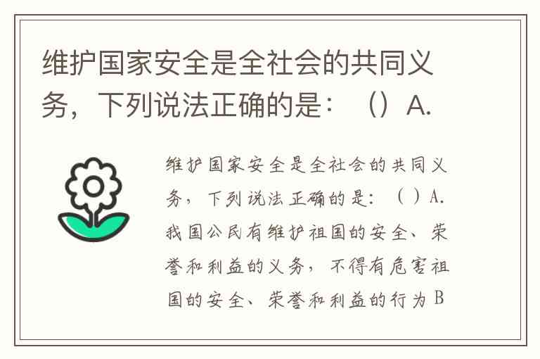 维护国家安全是全社会的共同义务,下列说法正确的是:()A.我国公民有维护祖国的安全、荣誉和利益的义务,不得有危害祖国的安全、荣誉和利益的行为 B.我国公民、一切国家机关和武装力量、各政党和各人民团体、企业事业组织和其他社会组织,都有维护国家安全的责任和义务 C.中国的主权和领土完整不容侵犯和分割 D.维护国家主权、统一和领土完整是包括港澳同胞和台湾同胞在内的全中国人民的共同义务