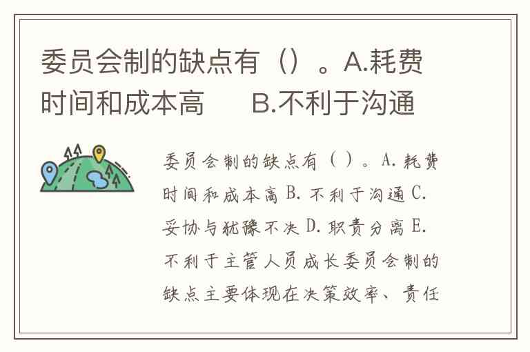 委员会制的缺点主要体现在决策效率、责任划分和利益协调三个层面。根据管理学研究,其核心缺陷包括:耗费时间和成本高(A)、妥协与犹豫不决(B)、职责分离(C)。
