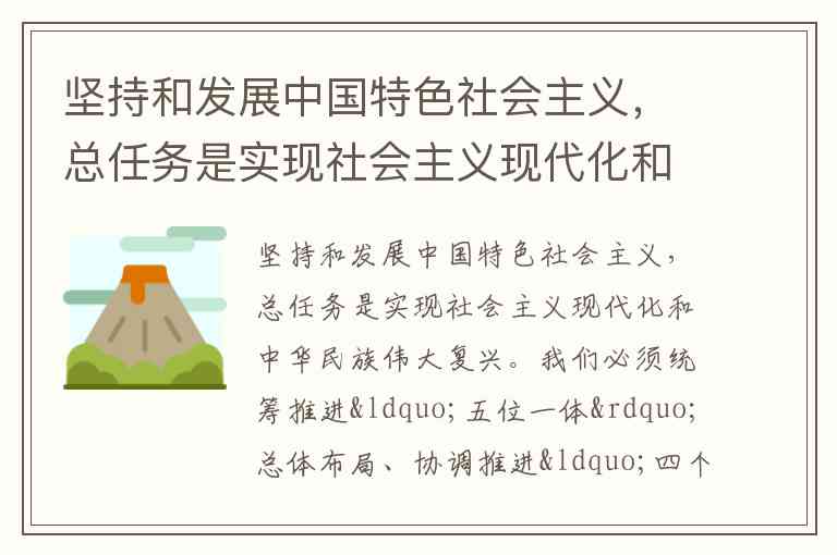 坚持和发展中国特色社会主义,总任务是实现社会主义现代化和中华民族伟大复兴。我们必须统筹推进“五位一体”总体布局、协调推进“四个全面”战略布局,一心一意为实现“两个一百年”奋斗目标而努力工作。