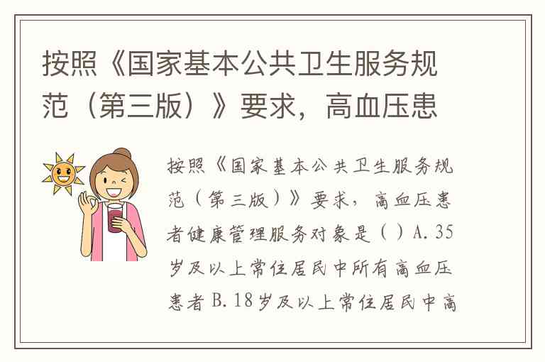 按照《国家基本公共卫生服务规范(第三版)》要求,高血压患者健康管理服务对象是()A.35岁及以上常住居民中所有高血压患者 B.18岁及以上常住居民中高血压患者 C.35岁及以上的户籍居民中高血压患者 D.35岁及以上常住居民中原发性高血压患者 E.65岁及以上常住居民中原发性高血压患者