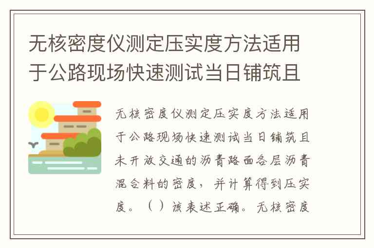 无核密度仪测定压实度方法适用于公路现场快速测试当日铺筑且未开放交通的沥青路面各层沥青混合料的密度,并计算得到压实度。()