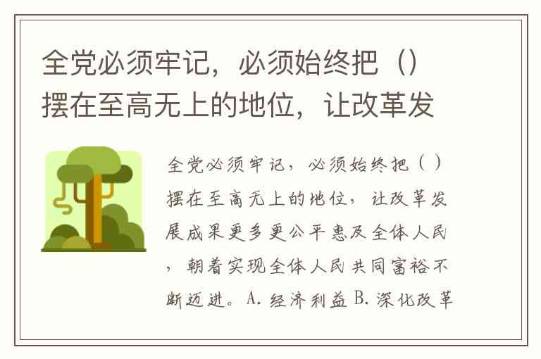 全党必须牢记,必须始终把()摆在至高无上的地位,让改革发展成果更多更公平惠及全体人民,朝着实现全体人民共同富裕不断迈进。A.经济利益 B.深化改革 C.人民利益 D.公平正义