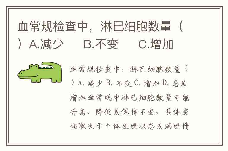 血常规中淋巴细胞数量可能升高、降低或保持不变,具体变化取决于个体生理状态或病理情况。从提供的参考文档可知,淋巴细胞数量受多种因素影响,不能简单地说它会减少、不变、增加或急剧增加。
