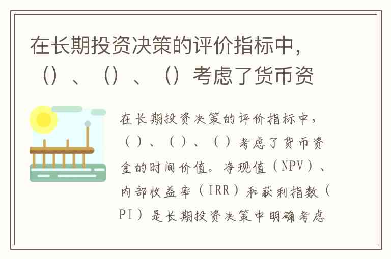 净现值(NPV)、内部收益率(IRR)和获利指数(PI)是长期投资决策中明确考虑货币时间价值的三大核心指标。这些指标通过将未来现金流折算为现值,解决了不同时间点资金价值不可直接比较的问题,为投资者提供了更科学的决策依据。
