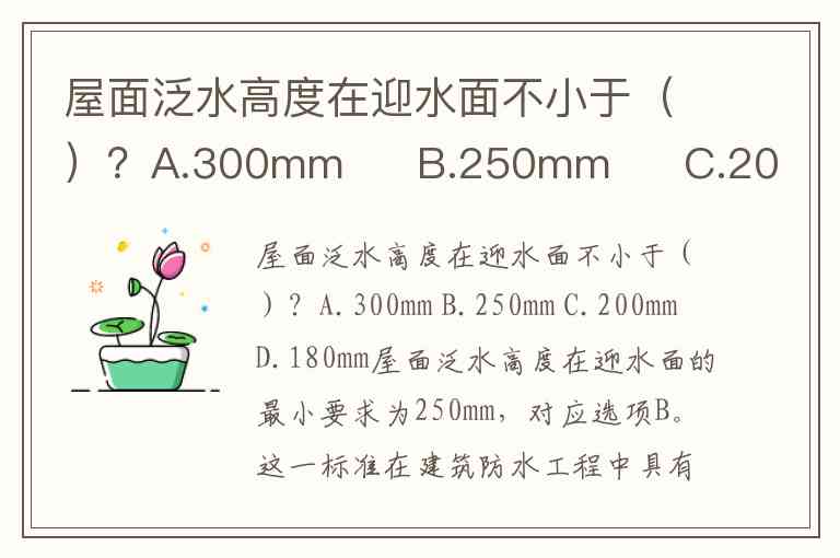 屋面泛水高度在迎水面不小于()?A.300mm B.250mm C.200mm D.180mm