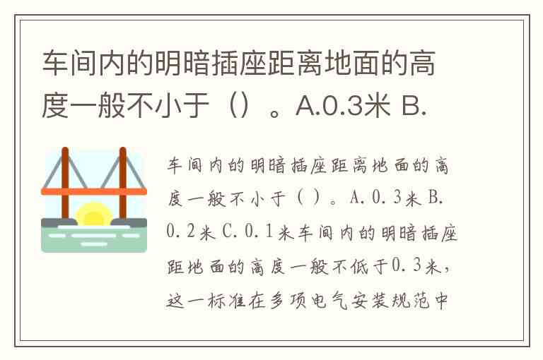 因此,从通用性和考题选项设置来看,正确答案应为A.0.3米。这一标准既符合国家电气规范对工业场所的基础要求,也体现了“预防地面环境风险”的核心设计逻辑。实际安装时,还需结合具体车间类型(如潮湿、高温)参考《建筑电气设计规范》进行调整,但题干中“一般不小于”的表述指向的是常规场景下的最低标准。