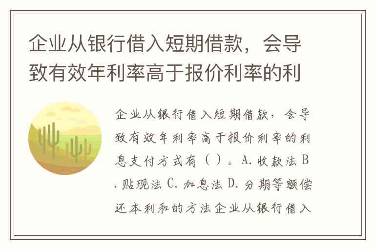 企业从银行借入短期借款,会导致有效年利率高于报价利率的利息支付方式有()。A.收款法 B.贴现法 C.加息法 D.分期等额偿还本利和的方法