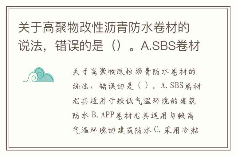 关于高聚物改性沥青防水卷材的说法,错误的是()。A.SBS卷材尤其适用于较低气温环境的建筑防水 B.APP卷材尤其适用与较高气温环境的建筑防水 C.采用冷粘法铺贴时,施工环境温度不应低于0℃ D.采用热熔法铺贴时,施工环境温度不应低于﹣10℃