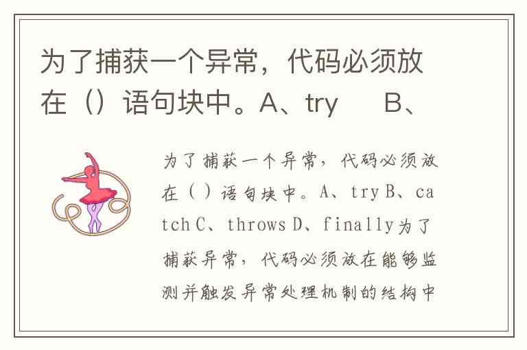 为了捕获一个异常,代码必须放在()语句块中。A、try B、catch C、throws D、finally
