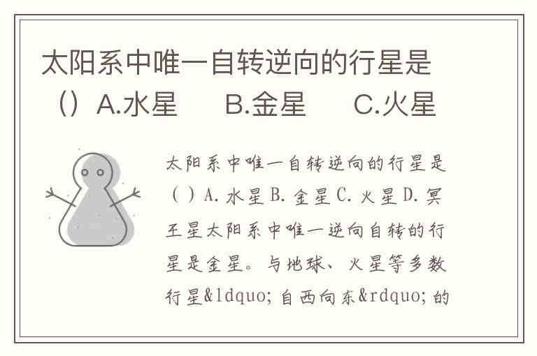 太阳系中唯一自转逆向的行星是()A.水星 B.金星 C.火星 D.冥王星