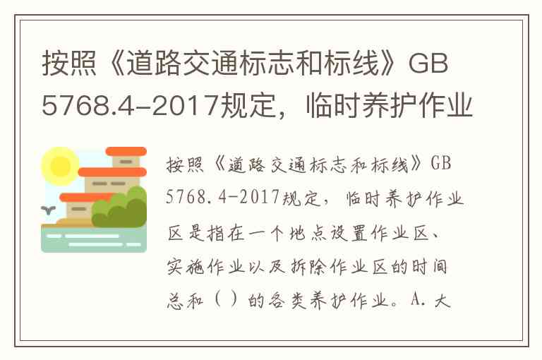 按照《道路交通标志和标线》GB5768.4-2017规定,临时养护作业区是指在一个地点设置作业区、实施作业以及拆除作业区的时间总和()的各类养护作业。A.大于24h B.大于4h且小于或等于24h C.大于30min且小于或等于4h D.不超过30min