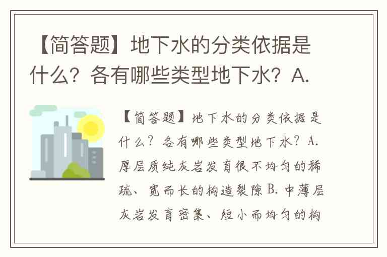【简答题】地下水的分类依据是什么?各有哪些类型地下水?A.厚层质纯灰岩发育很不均匀的稀疏、宽而长的构造裂隙 B.中薄层灰岩发育密集、短小而均匀的构造裂隙,岩溶发育均匀而强烈 C.泥质灰岩形成的裂隙张开宽度比较小,延伸性也比较差,不利于岩溶的发育 D.厚层质纯灰岩有利于形成大型岩溶洞穴,但岩溶发育极不均匀
