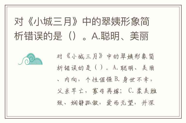 《小城三月》中翠姨的形象分析需结合其身世、性格与悲剧命运。根据文本细节,选项D“是一个童养媳”存在明显错误,翠姨实为“较为富裕的地主家庭出身”,由母亲包办与有钱人家订婚,而非童年被收养的童养媳。
