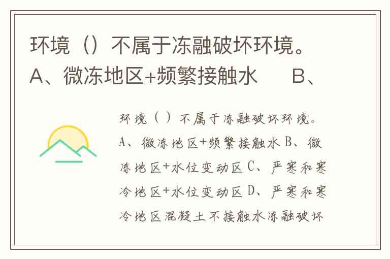环境()不属于冻融破坏环境。A、微冻地区+频繁接触水 B、微冻地区+水位变动区 C、严寒和寒冷地区+水位变动区 D、严寒和寒冷地区混凝土不接触水