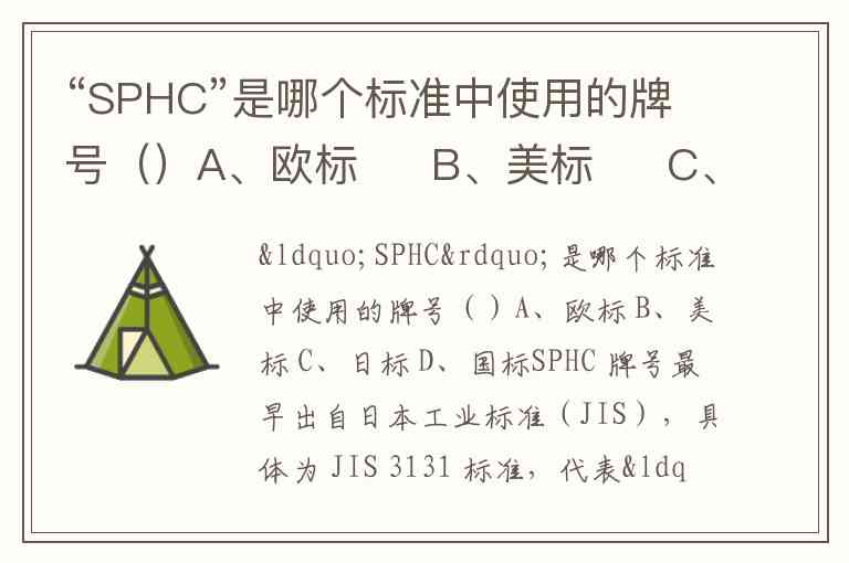 SPHC 牌号最早出自日本工业标准(JIS),具体为 JIS 3131 标准,代表“一般用热轧钢板及钢带”(S-钢 Steel,P-板 Plate,H-热 Heat,C-商业 Commercial)。尽管国内部分企业标准(如宝钢 Q/BQB 302、首钢 Q/SG 314 等)也采用这一牌号,但溯源其起源为日标。类似地,冷轧牌号 SPCC 同样源自 JIS 标准体系,进一步印证了这一日系渊源。因此,该题答案为 C、日标。