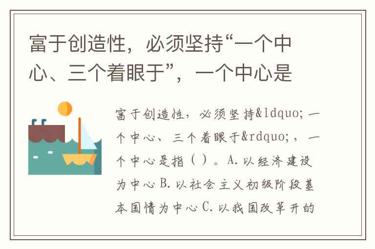 富于创造性,必须坚持“一个中心、三个着眼于”,一个中心是指()。A.以经济建设为中心 B.以社会主义初级阶段基本国情为中心 C.以我国改革开的和现代化建设的实际问题、以我们正在做的事情为中心 D.以马克思主义为中心