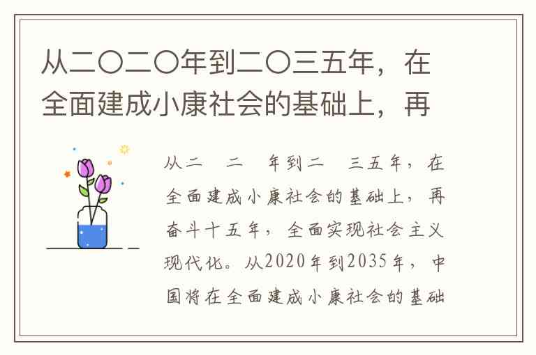 从二〇二〇年到二〇三五年,在全面建成小康社会的基础上,再奋斗十五年,全面实现社会主义现代化。