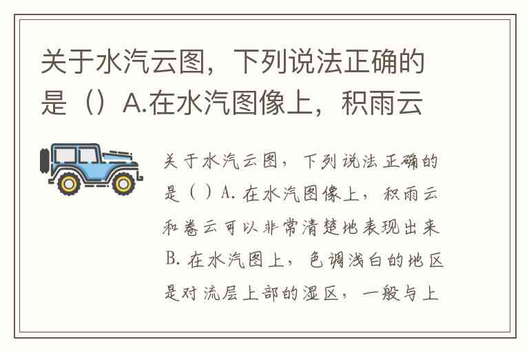 关于水汽云图,下列说法正确的是()A.在水汽图像上,积雨云和卷云可以非常清楚地表现出来 B.在水汽图上,色调浅白的地区是对流层上部的湿区,一般与上升运动相对应 C.水汽图像与红外图像类似,其图像的形状和范围与云系匹配较好 D.当大气中的水汽含量较大时,水汽通道测量的辐射主要来自大气上层