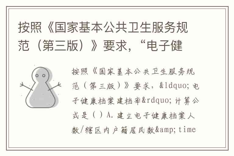 按照《国家基本公共卫生服务规范(第三版)》要求,“电子健康档案建档率”计算公式是()A.建立电子健康档案人数/辖区内户籍居民数×100% B.建立健康档案人数/辖区内常住居民数×100% C.年度内建立健康档案人数/辖区内建档居民数×100% D.建立电子健康档案人数/辖区内常住居民数×100% E.年度内建立电子健康档案人数/辖区内常住居民数×100%