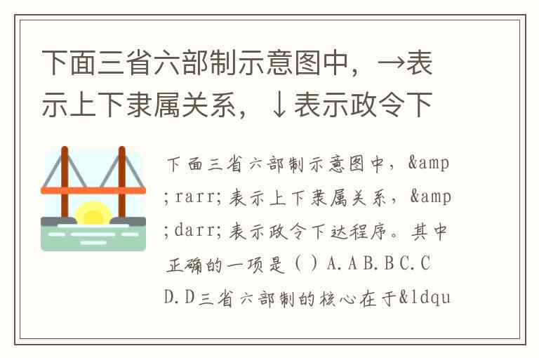 根据历史试题验证,正确答案为B。例如2010年上海黄浦区高三学业测评题明确,修建水利工程的程序是“中书省→门下省→尚书省→工部”,这一流程既体现了政令下达顺序(中书→门下→尚书),也反映了尚书省与六部的隶属关系(尚书省统领工部)。其他选项或混淆上下隶属关系(如将六部置于中书/门下省之下),或颠倒政令流程(如尚书省先于门下省),均不符合制度设计。