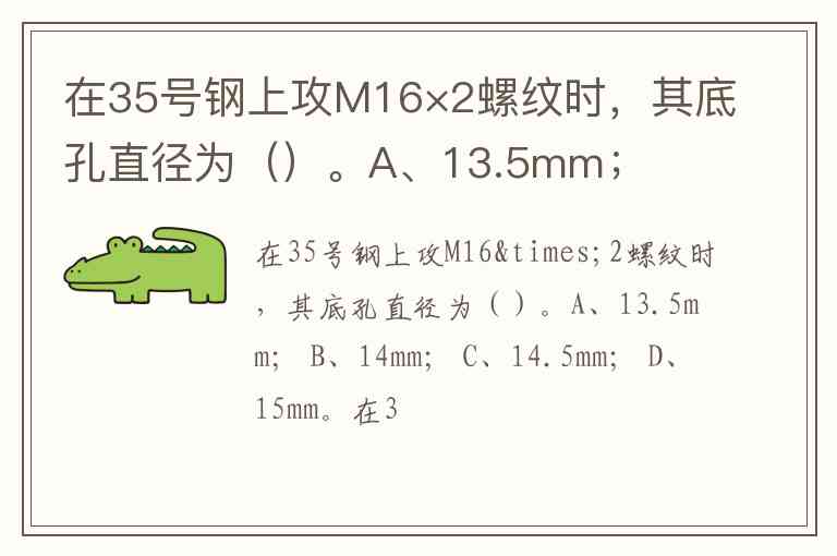 在35号钢上攻M16×2螺纹时,其底孔直径为()。A、13.5mm; B、14mm; C、14.5mm; D、15mm。