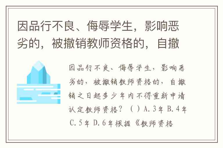 因品行不良、侮辱学生,影响恶劣的,被撤销教师资格的,自撤销之日起多少年内不得重新申请认定教师资格?()A.3年 B.4年 C.5年 D.6年