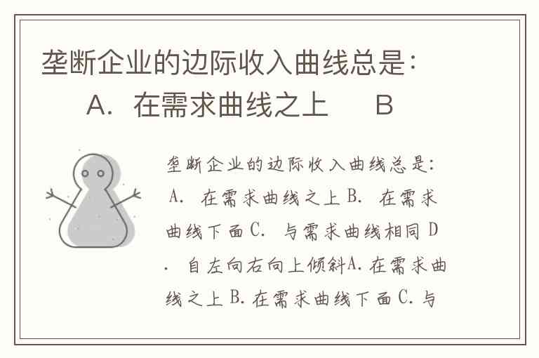 垄断企业的边际收入曲线总是: A.在需求曲线之上 B.在需求曲线下面 C.与需求曲线相同 D.自左向右向上倾斜A.在需求曲线之上 B.在需求曲线下面 C.与需求曲线相同