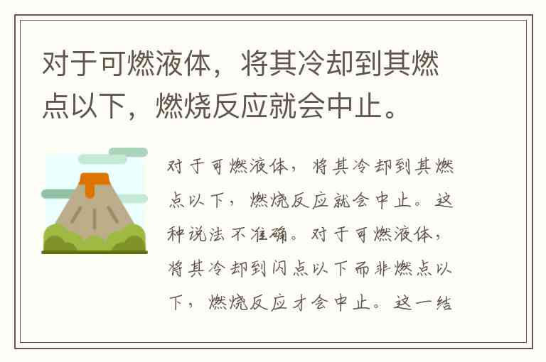 这种说法不准确。对于可燃液体,将其冷却到闪点以下而非燃点以下,燃烧反应才会中止。这一结论源于闪点与燃点的本质区别:闪点是液体蒸气与空气混合后遇火源能发生闪燃(一闪即灭)的最低温度,而燃点是蒸气能维持持续燃烧5秒以上的最低温度,且同一液体的燃点通常比闪点高0-20℃。