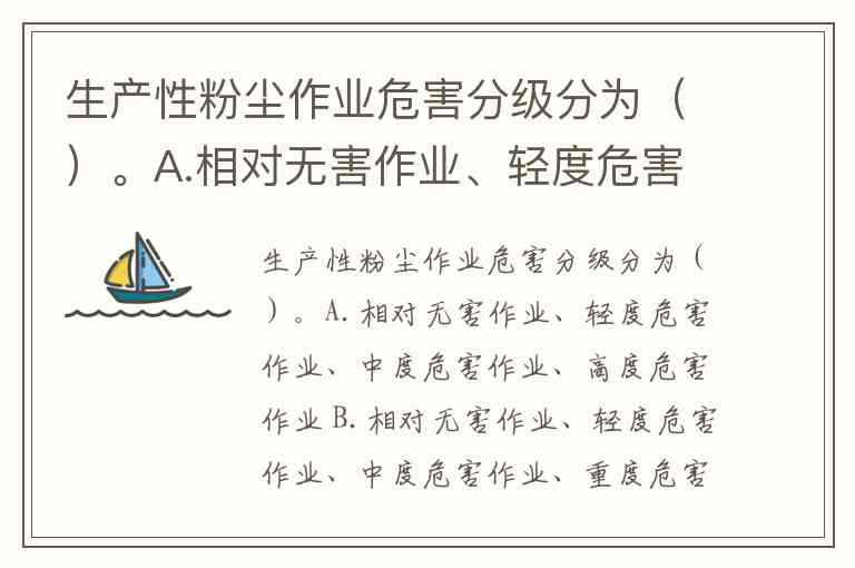生产性粉尘作业危害分级分为()。A.相对无害作业、轻度危害作业、中度危害作业、高度危害作业 B.相对无害作业、轻度危害作业、中度危害作业、重度危害作业 C.轻度危害作业、中度危害作业、重度危害作业、极重度危害作业