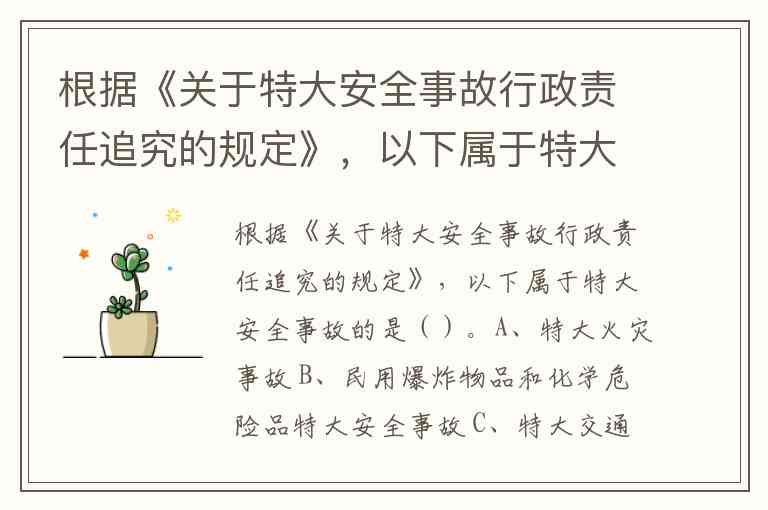 根据《关于特大安全事故行政责任追究的规定》,以下属于特大安全事故的是()。A、特大火灾事故 B、民用爆炸物品和化学危险品特大安全事故 C、特大交通安全事故 D、特大建筑质量安全事故