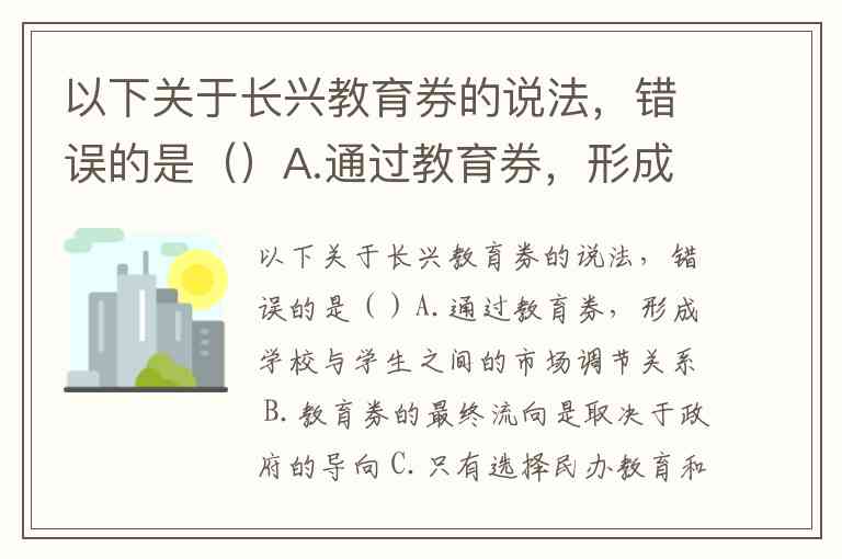 以下关于长兴教育券的说法,错误的是()A.通过教育券,形成学校与学生之间的市场调节关系 B.教育券的最终流向是取决于政府的导向 C.只有选择民办教育和职业学校的学生才可以获得教育券 D.教育经费的主体以政府拨款的形式流向公立学校