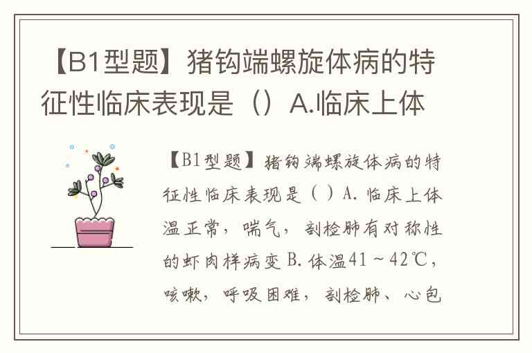 【B1型题】猪钩端螺旋体病的特征性临床表现是()A.临床上体温正常,喘气,剖检肺有对称性的虾肉样病变 B.体温41~42℃,咳嗽,呼吸困难,剖检肺、心包等处有大量的白色纤维素渗出,与胸腔粘连,肺有坏死灶、化脓灶 C.体温41~42℃,咳嗽,呼吸困难,剖检肺、心包、胸腹腔等处有大量的白色纤维素渗出,关节肿大跛行 D.病猪鼻腔分泌物多,鼻炎,打喷嚏,眼睑下方有泪斑,鼻变形-甚至鼻甲骨萎缩消失 E.体温41℃左右,可视黏膜,全身皮肤变黄(黄染),血红蛋白尿(尿液红色),头颈部皮下水肿,剖检肝细胞坏死